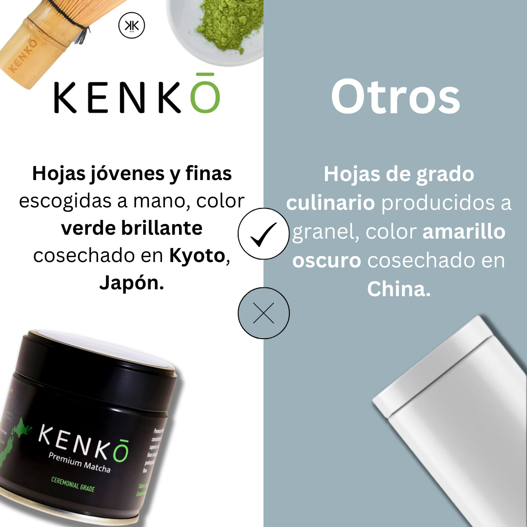 Premium Matcha de grado Ceremonial, 100% orgánico y cosechado artesanalmente en los campos de Kyoto, Japón. Su calidad es superior a cualquier otro en el mercado, pues contiene las hojas más jóvenes y finas escogidas a mano. Su proceso de molido es más prolongado que los tradicionales convirtiéndolo en un polvo fino 🍵